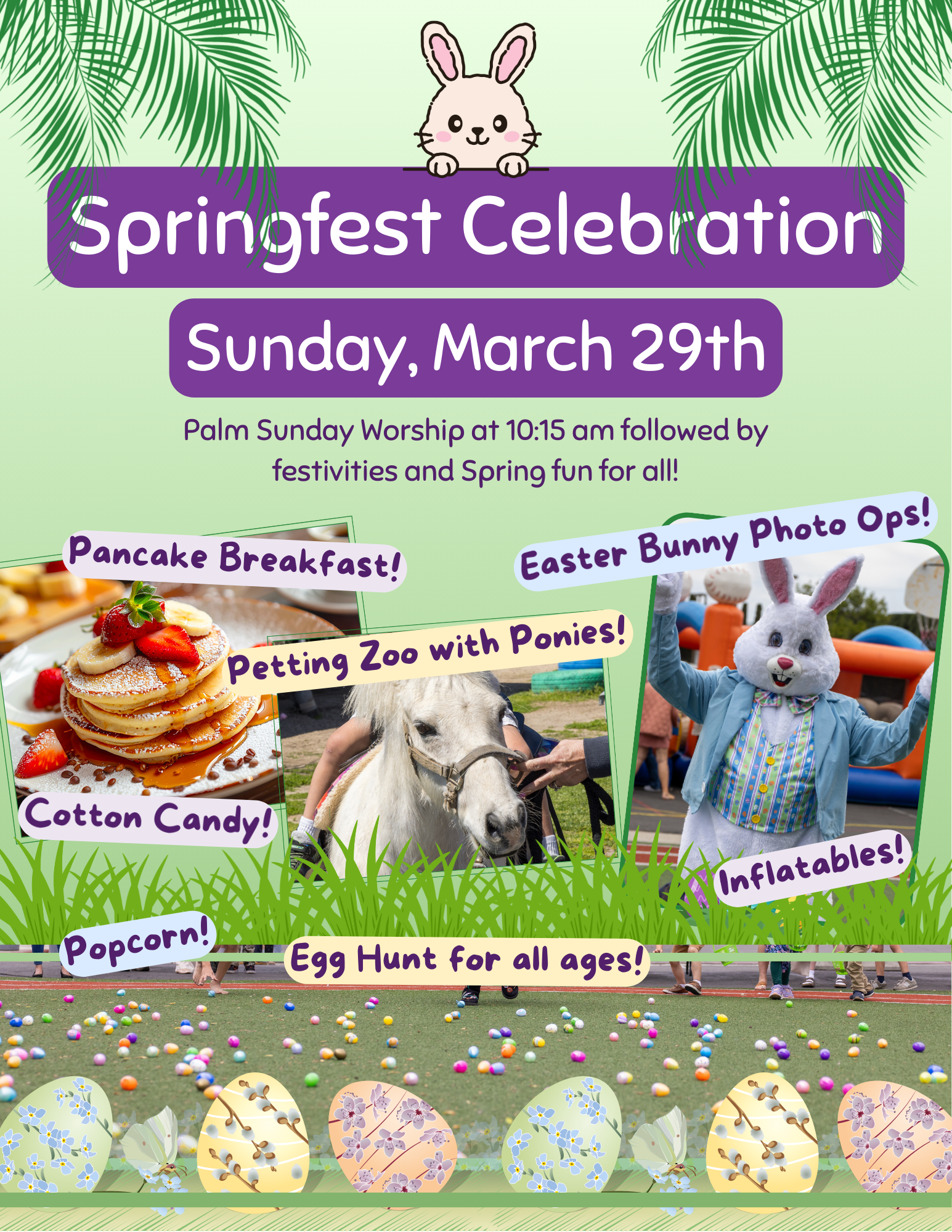 Join us for a joyful Palm Sunday celebration filled with worship, community, and springtime fun for all ages! After Palm Sunday worship, our campus will come alive with festivities designed for the whole family to enjoy together.